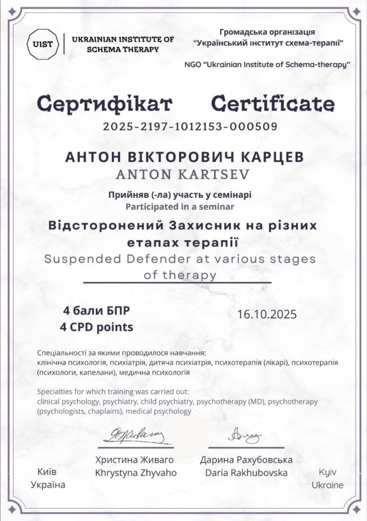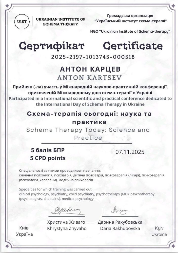 - Украинский Институт Когнитивно-Поведенческой терапии 2018 - Emotionally Focused Therapy (EFT) for couples, standard and advansed level.